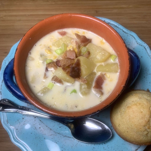 Try grandma's corn chowder recipe for a creamy, delicious bowl of comforting soup made with creamed corn, potatoes, half-and-half, and bacon.