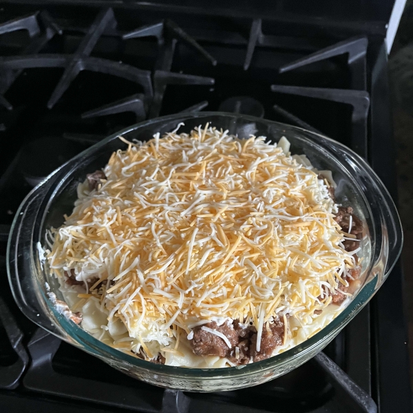 Layer 1/2 of the egg noodles into the prepared casserole dish. Top with 1/2 of the sour cream mixture, then 1/2 of the ground beef mixture. Repeat layers once more. Sprinkle Cheddar cheese over top.