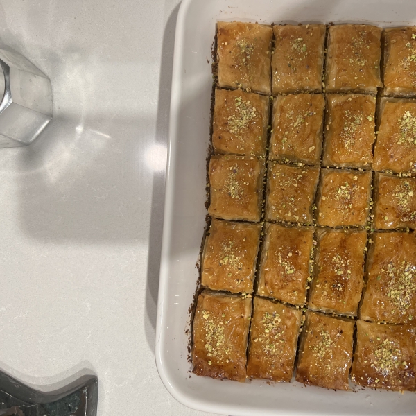 Remove baklava from oven and immediately spoon sauce over it. Let cool. Serve in cupcake papers. This freezes well. Leave it uncovered as it gets soggy if it is wrapped up.