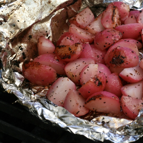 Place foil packet on the grill, close lid, and grill for 15 minutes, flipping every 5 minutes. If you like the radishes extra caramelized, grill for 3 to 5 minutes longer.