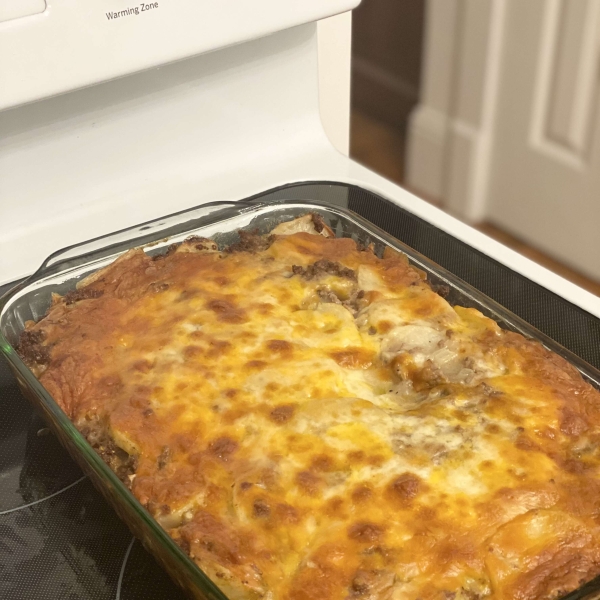Hamburger potato casserole is an oldie but a goodie! This recipe layers ground beef and potatoes with mushroom soup, onion, and Cheddar cheese.
