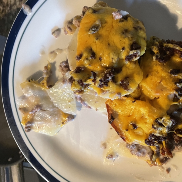 An oldie but a goodie! A family recipe of ground beef and potatoes layered with mushroom soup and onion, and topped with Cheddar cheese.