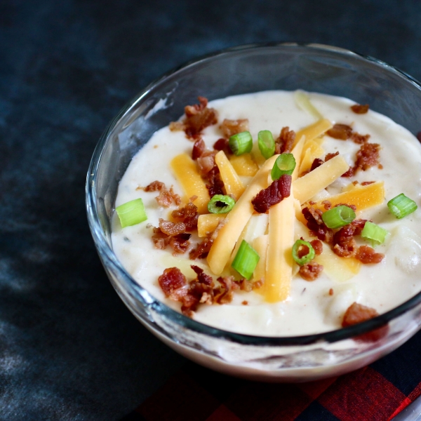 Drop in softened cream cheese and stir with a whisk until melted and mixed in. Ladle into bowls and garnish with Cheddar, bacon bits, and green onions.