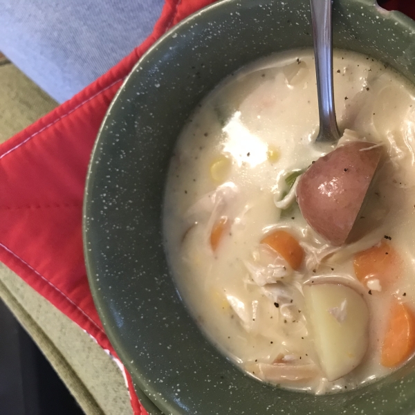 This hearty, creamy homemade chicken stew is packed with fresh and frozen vegetables and tender bites of chicken.