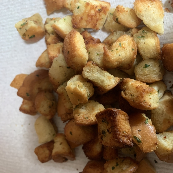 Place bread in the basket of the air fryer and cook for 4 minutes. Toss with a spatula and cook for 2 minutes more. Transfer croutons to a paper towel-lined plate until ready to use.