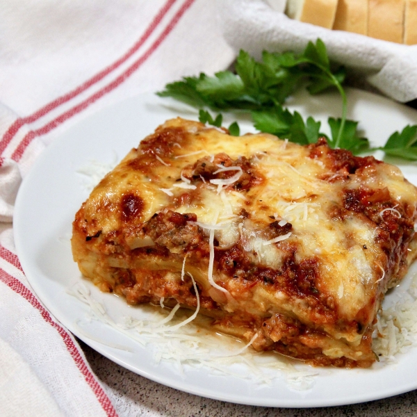 This mom's homemade lasagna is a family favorite. The recipe pairs a meaty, from-scratch tomato sauce with a cheesy filling and lots of mozzarella on top.