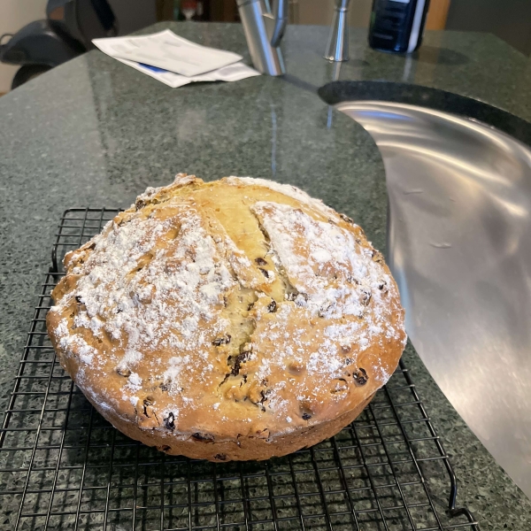 This soda bread recipe made with flour, baking soda, buttermilk, sour cream, and caraway seeds is sweetened with raisins. Best served warm with butter.