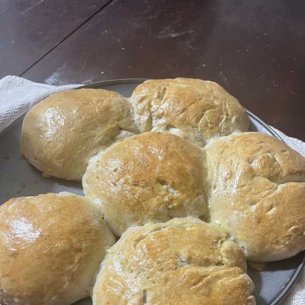 Punch dough down and divide into 8 equal portions. Shape each portion into a 4-inch round loaf; place four loaves onto each prepared baking sheet. Cover and let rise in a warm place until doubled in volume, about 35 minutes.