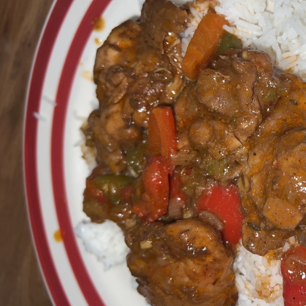 This brown stew chicken is delicious served over steamed rice with green peas, garnished with fresh thyme. I've wanted to make this for a while since I love braised or stewed chicken recipes, especially ones with similar ingredients as jerk chicken. While I might make a few adjustments next time, this came out amazingly well.