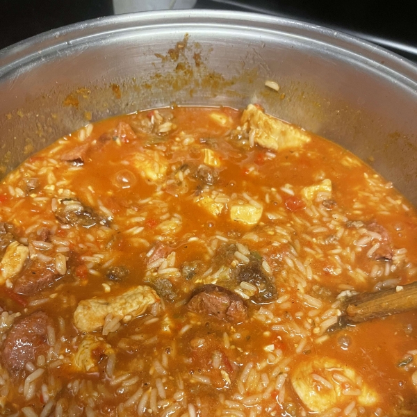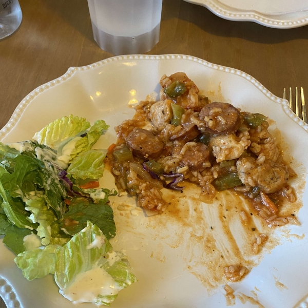 A spicy jambalaya with chicken, andouille sausage, rice and Cajun seasonings that's easy to make in one pot.