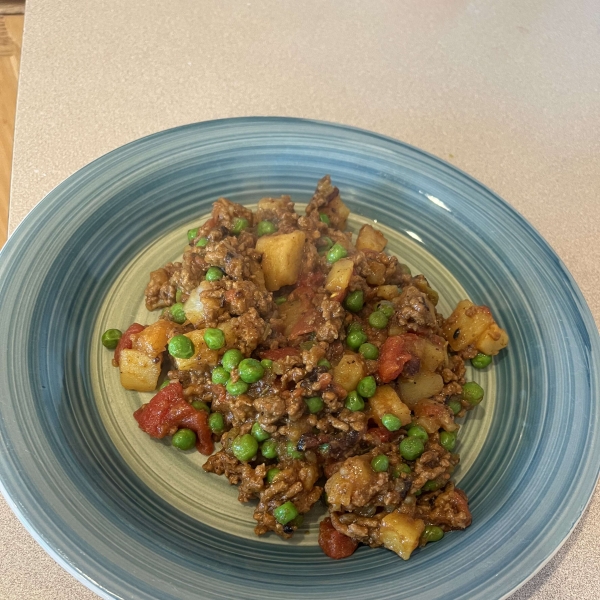 Keema aloo is an Indian curry made with ground beef and potatoes, tomatoes, peas, fresh ginger, cilantro, and lots of spices for a flavor-packed meal.