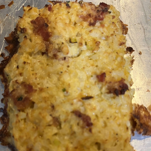 Cauliflower, Cheddar cheese, and bacon bits come together in this low-carb, keto alternative to hash browns.