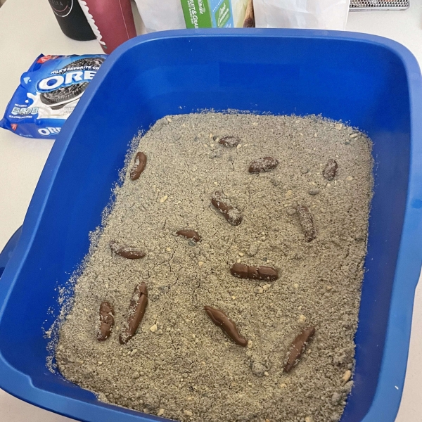 Crumble cooled cakes into a large bowl. Add 1/2 of the uncolored cookie crumbs and some chilled pudding; toss to blend, adding more pudding as needed until mixture is moist but not soggy. Pour mixture into the kitty litter box.