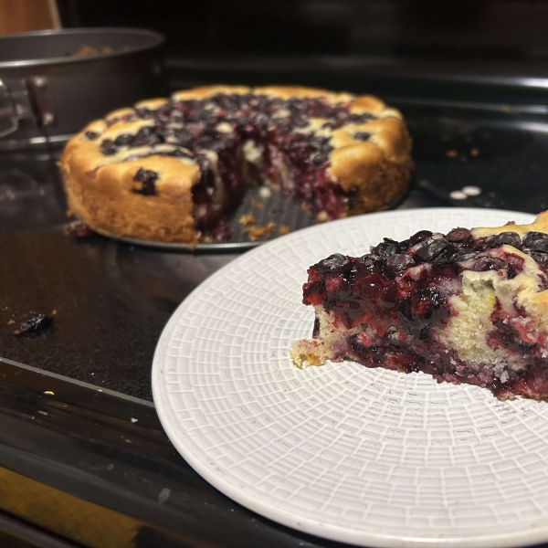 Pour 1/2 the batter into the prepared pan and spread evenly. Spread 1/2 the blueberry mixture over batter. Pour in remaining cake batter and spread remaining blueberries on top, pushing them halfway into the batter.