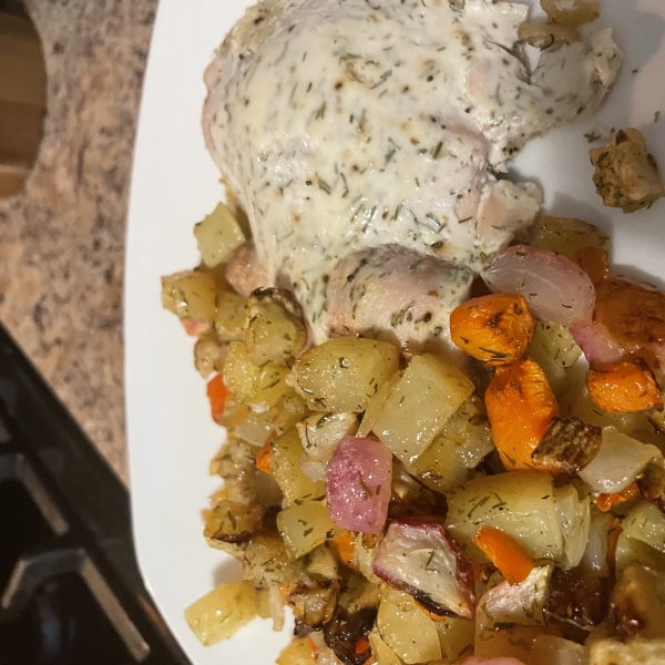 Lemon, Yogurt, and Dill Chicken Thighs with Roasted Veggies