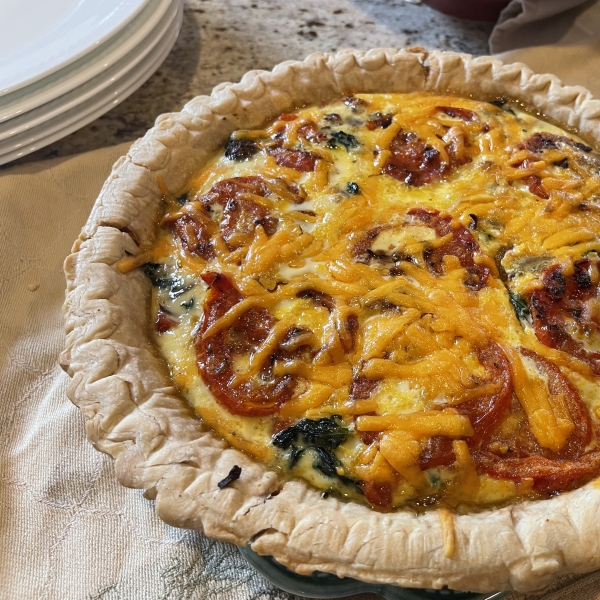 Spread 1 cup cheese in the bottom of pie crust. Layer vegetable mixture over the cheese, then top with tomato slices. Pour egg mixture over top and sprinkle with remaining 1/2 cup cheese.