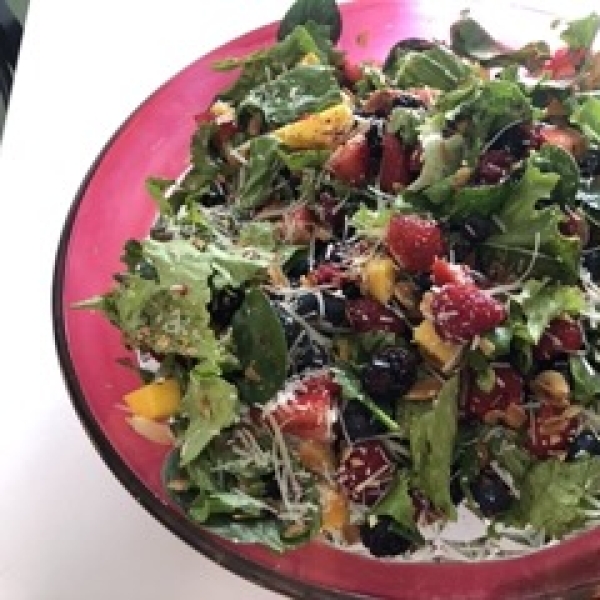 In a bowl, toss the remaining mango, salad greens, cilantro, and onion. Drizzle with the dressing mixture. Top each serving with equal amounts of raspberries, blackberries, strawberries, blueberries, and hazelnuts. Sprinkle with Parmesan cheese.
