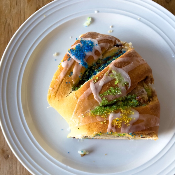 King cake is a sweet and colorful cake filled with cinnamon, sugar, pecans, and, if you're lucky, a plastic baby traditionally served at Mardi Gras.