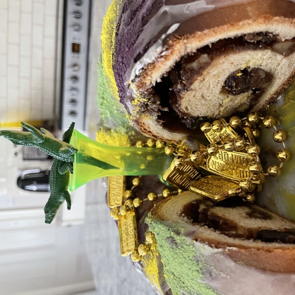 The King Cake is a New Orleans tradition that involves a pastry, a tiny plastic baby, and a party. King Cake is baked with a tiny plastic baby hidden inside; whoever gets the slice with the baby in it has to host the next party. Make sure to buy a new tiny plastic baby so you can get the full effect from this cake! Sprinkle with purple, green, and gold sugar, or decorate with whole pecans and candied cherries.