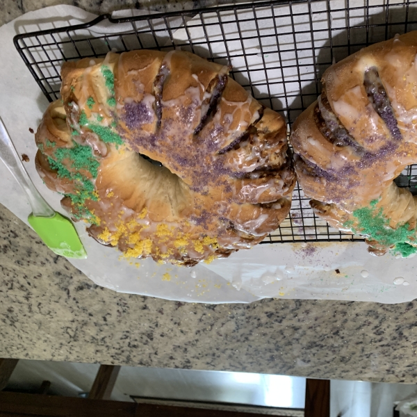 The King Cake is a New Orleans tradition that involves a pastry, a small plastic baby, and a party. The King Cake is baked with a small plastic baby hidden inside, the person who gets the slice with baby in it has to host the next party.