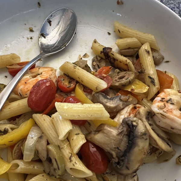 Peppers, chicken breast, pasta, and Italian cheeses are baked until bubbly in this delicious one-pot recipe for two.
