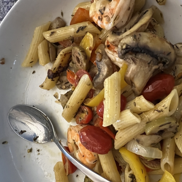 Vegetables, chicken breast, pasta, and Italian cheeses are baked until bubbly for a delicious one-pot dinner for two. I like to serve this with a light salad and crisp white wine.