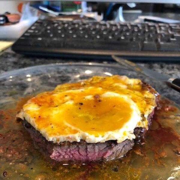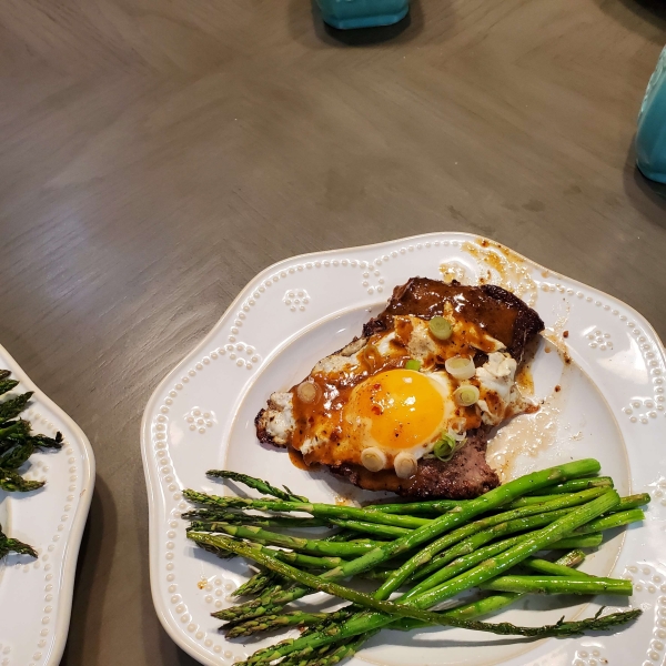 Chef's John's quick and easy breakfast of champions features a juicy, tender sirloin steak topped with a perfectly fried egg and a buttery hot sauce.