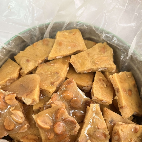 Stir in peanuts and set a candy thermometer in place. Continue cooking, stirring occasionally, until the temperature reaches 300 to 310 degrees F (150 to 155 degrees C)