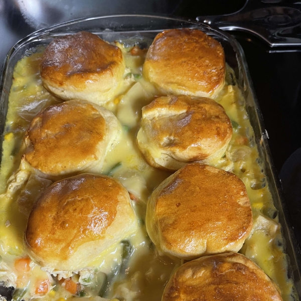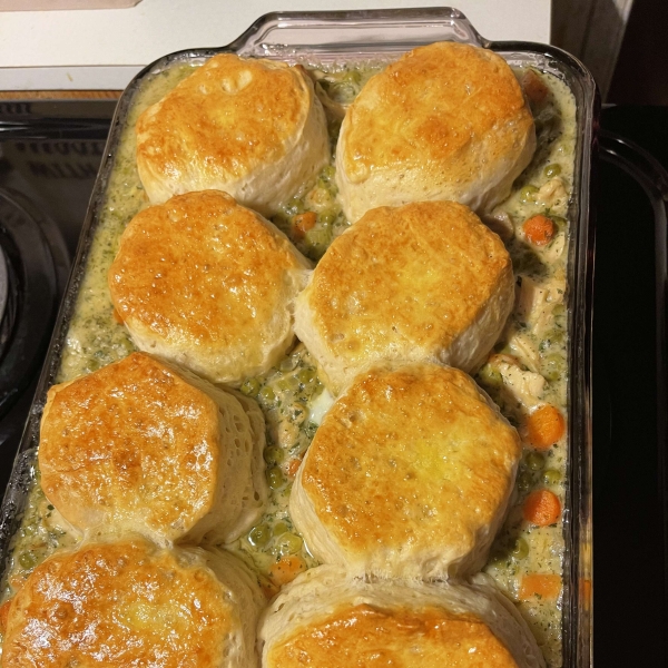 This delicious chicken pot pie with biscuits is a comforting dinner that's quick to put together with simple ingredients from your kitchen.