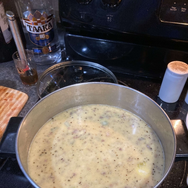 Pour in half-and-half and add butter. Drain clams, reserving clam liquid; stir clams and 1/2 of the clam liquid into the soup. Cook until heated through, without boiling, about 5 minutes.
