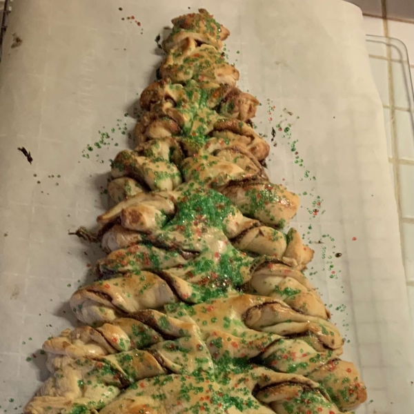 Lightly score puff pastry into the shape of a Christmas tree (triangle) with a wide base. Spread chocolate-hazelnut spread over the triangle in a thin layer with the back of a spoon.