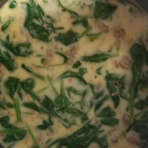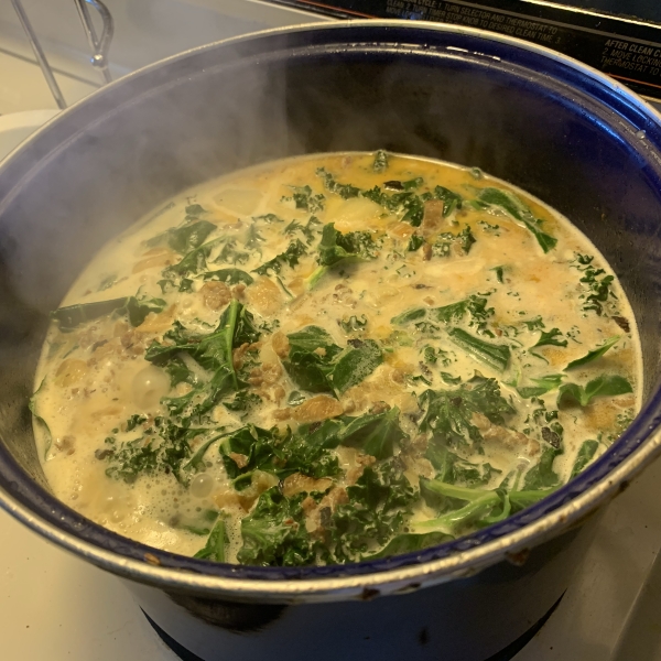 Pour in cream; simmer until heated through, about 2 minutes. Add sausage, onion mixture, and kale; cook and stir until flavors combine, about 10 minutes.