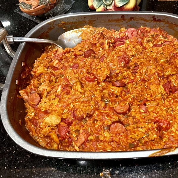A sixteen-serving batch of Creole classic! Chicken, ham, shrimp, and Andouille sausage are combined with onion celery, green pepper and garlic. Tomatoes, chicken stock and rice are stirred in, and the whole thing is baked in a large roasting pan.