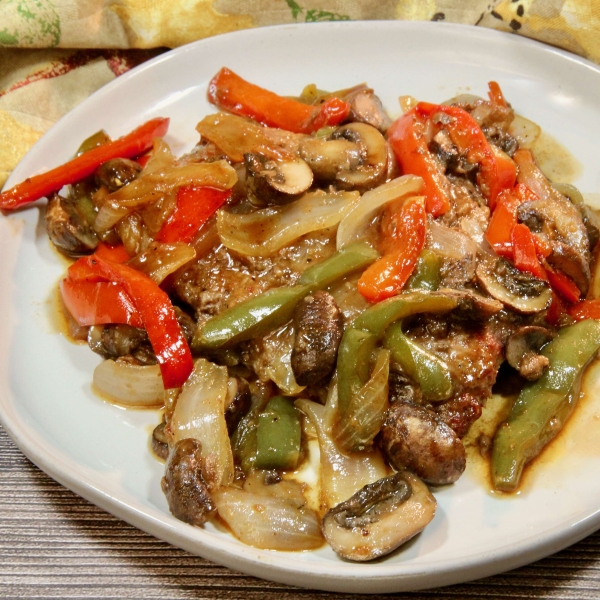Onions and peppers top seared cube steak that's cooked in the oven. A less expensive option than other steaks that still delivers tons of flavor.