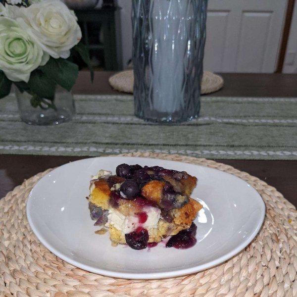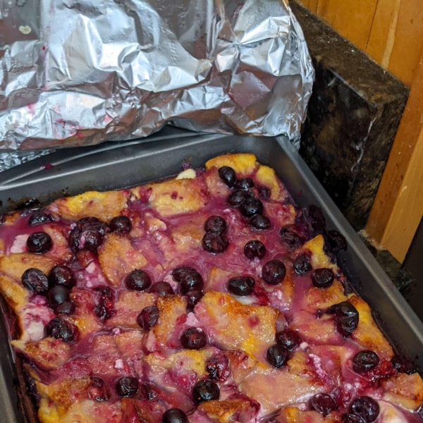 Prepare casserole: Lightly grease a 9x13-inch baking dish. Arrange 1/2 of the bread cubes in the dish and top with cream cheese cubes. Sprinkle blueberries over the cream cheese, then top with remaining bread cubes.
