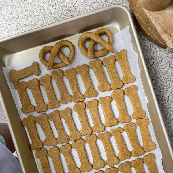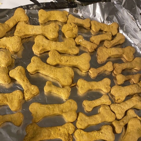 Bake in the preheated oven until dog treats are golden brown and crunchy, about 40 minutes. Let cool before serving to your dog.