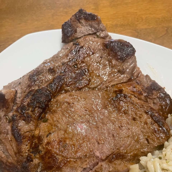 Heat a nonstick skillet over medium-high heat. Sear and cook the steak in the hot skillet for 3 to 4 minutes on each side for medium rare, or to your desired degree of doneness. An instant-read thermometer inserted into the center should read 130 degrees F (54 degrees C) for medium rare.