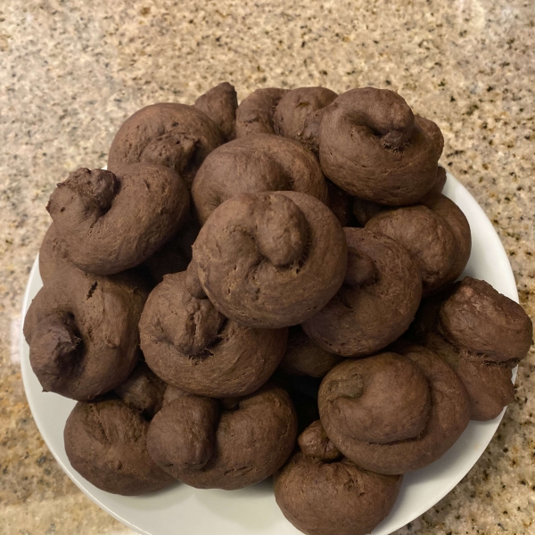 Roll dough into long, thin 8-inch ropes, pinching one end into a pointy tip. Arrange in the shape of a little poop-mound with the pointy tip on top; place onto the prepared baking sheet, leaving space between individual cookies.
