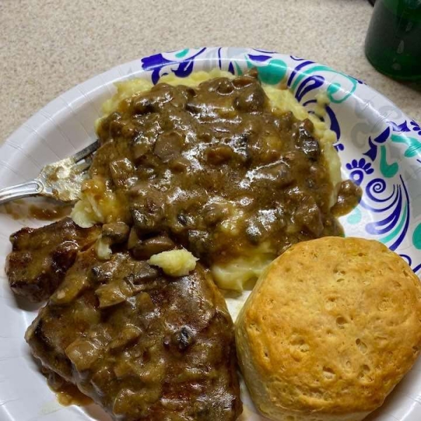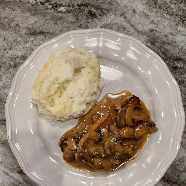 These pork chops with mushroom gravy are made with juicy boneless pork chops seared on the stovetop and simmered in a garlicky mustard mushroom sauce.