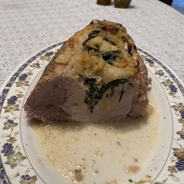 Pork loin stuffed with spinach, onion, garlic and bread crumbs, basted in a fabulous sweet sauce.