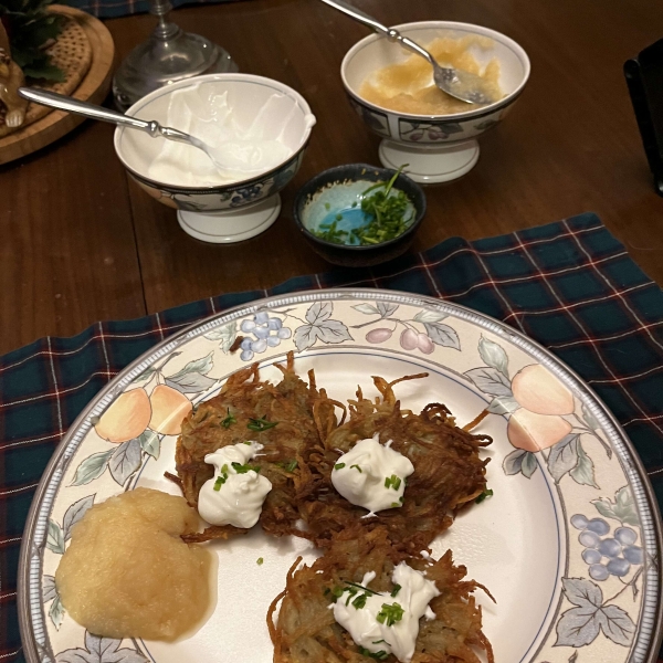 Remove to a paper towel-lined plate to drain while you cook any remaining latkes. Serve hot.