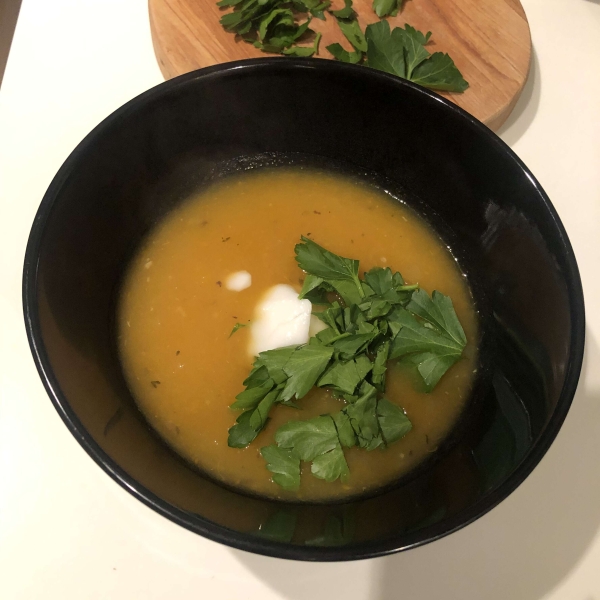 This delicious pumpkin soup is made with tender browned onions, garlic, herbs, and pureed pumpkin. Cream added at the end makes it lusciously smooth!