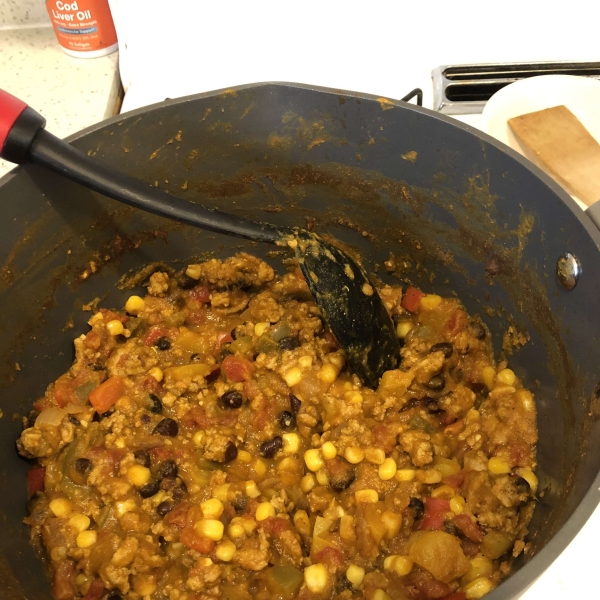 A chili for autumn! Turkey, pumpkin, and traditional chili ingredients go together well in this spicy concoction.
