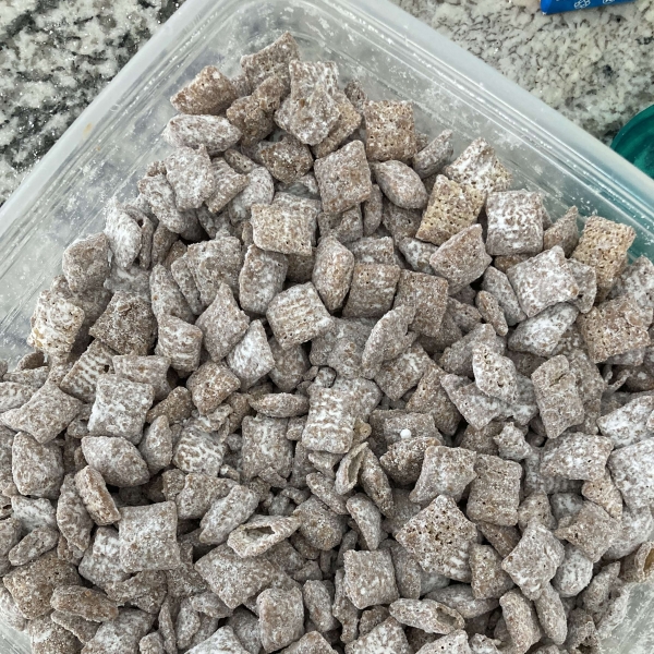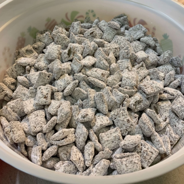 Homemade puppy chow is a favorite holiday treat that's easy to make with just 4 ingredients: peanut butter, chocolate, Chex cereal, and confectioners' sugar.