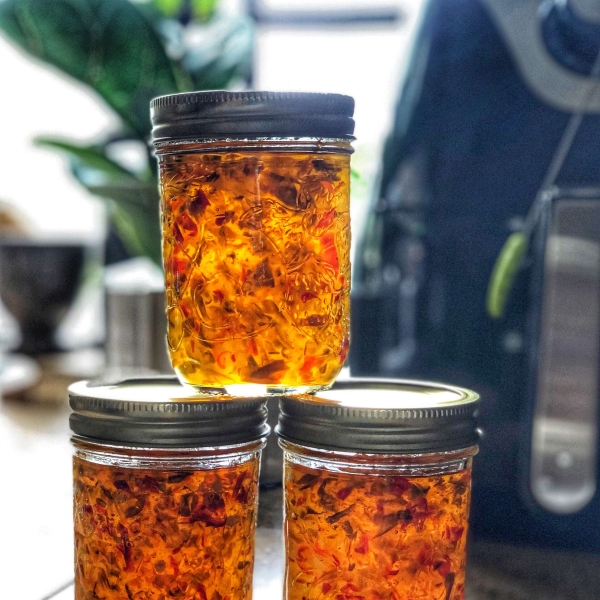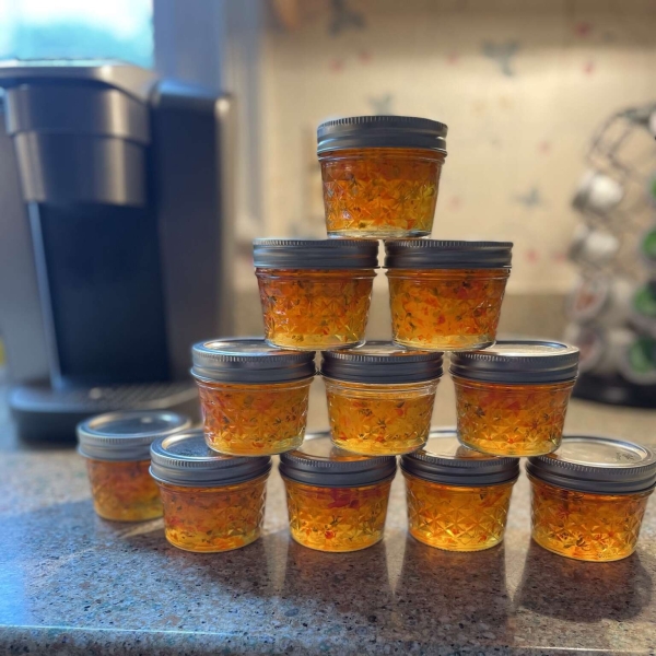 This is a beautiful jelly of red bell peppers and green jalapenos. It's a perfect relish to many holiday favorites, or serve it with cream cheese on a cracker.