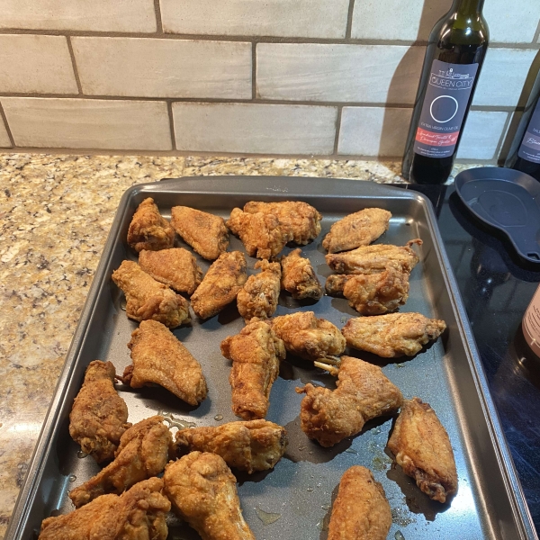 Fry coated wings in the hot oil for 10 to 15 minutes, or until they begin to crisp and turn brown. Maintain the oil temperature while cooking. Remove cooked wings from hot oil and let drain on paper towels or a wire rack.