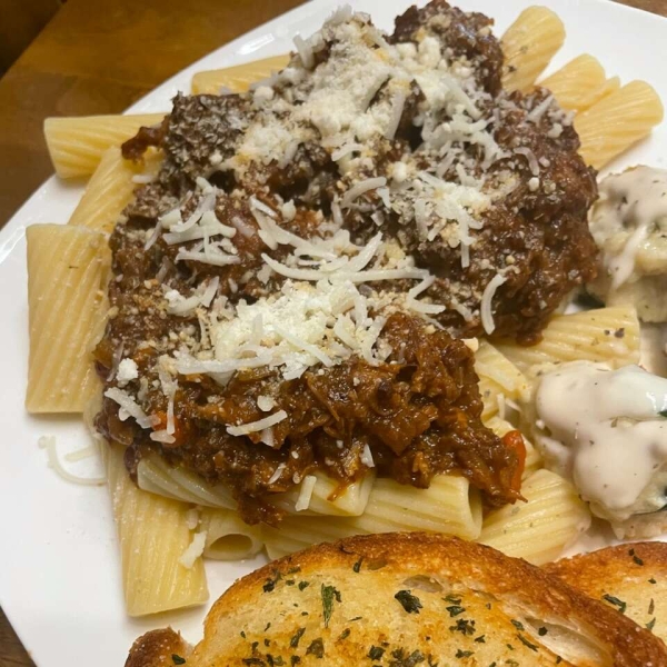 Chef John's "salsa genovese" with rigatoni pasta is the best, featuring low-and-slow-simmered chunks of beef, pancetta, and onions for tons of flavor.