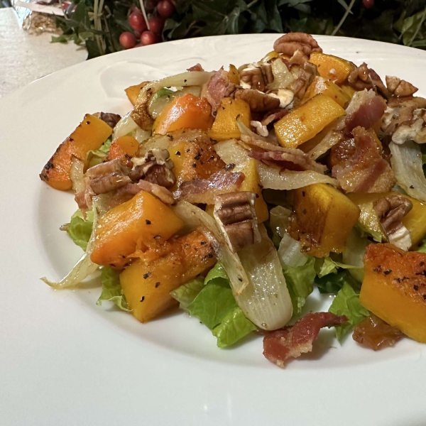 This butternut squash salad with tender onions, crispy bacon, and toasted pecans is drizzled with maple syrup and served warm for a fabulous fall meal.