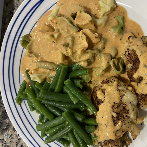 A light and creamy sauce with puree of roasted red peppers as the base. It is excellent on any type of pasta, but tortellini or ravioli seems to be the best match. The prep time is rather long, but the result is definitely worth it. Freezes well. In fact, the taste may improve slightly.