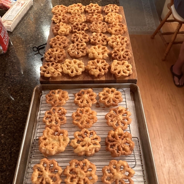 Rosettes are festive Swedish cookies made with a simple batter fried in a lacy pattern with a rosette iron until crispy, then dusted with powdered sugar.